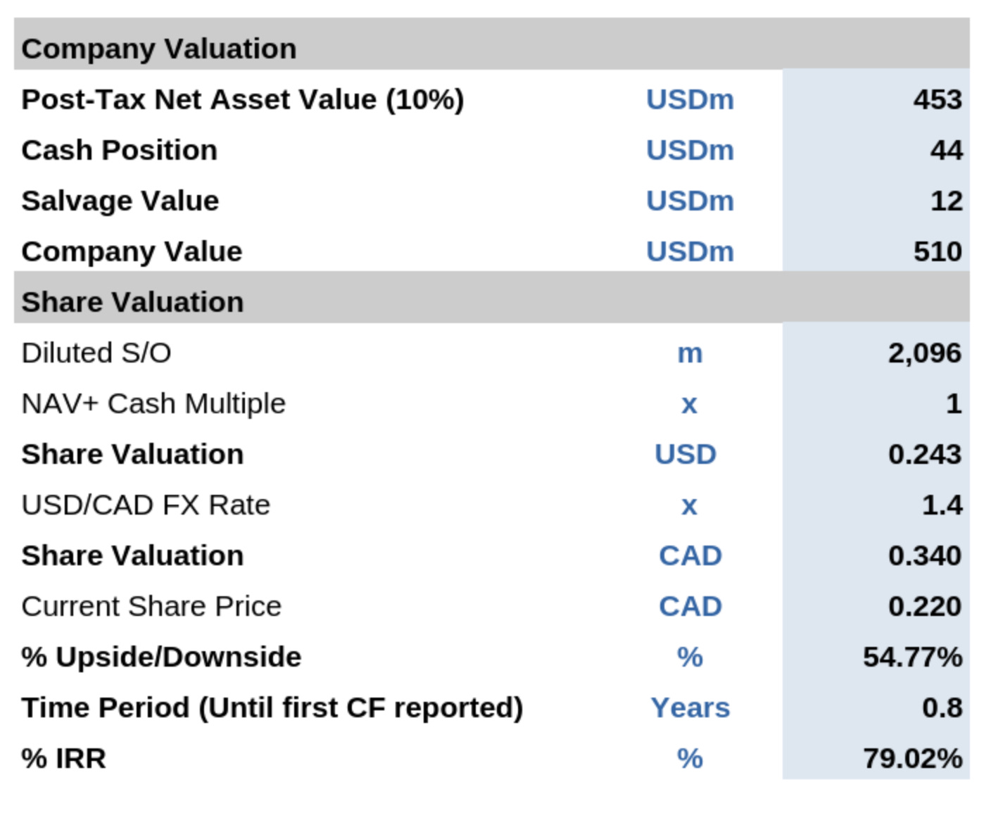 I model Net Asset Value (10% discounted, inclusive of debt repayments) to be U.S. $453m, at spot commodity prices. What does this mean for the shares? Taking into account cash, salvage value, and dilution, the mine ramp up offers shareholders an attractive 79% IRR: