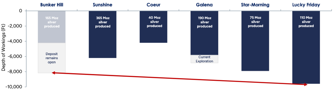 At Bunker Hill, the deposit remains open at depth. Many other mines across the same system have expanded operations to double the present maximum depth at Bunker Hill, ~4,000 ft.