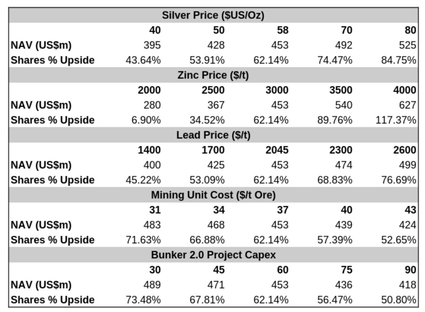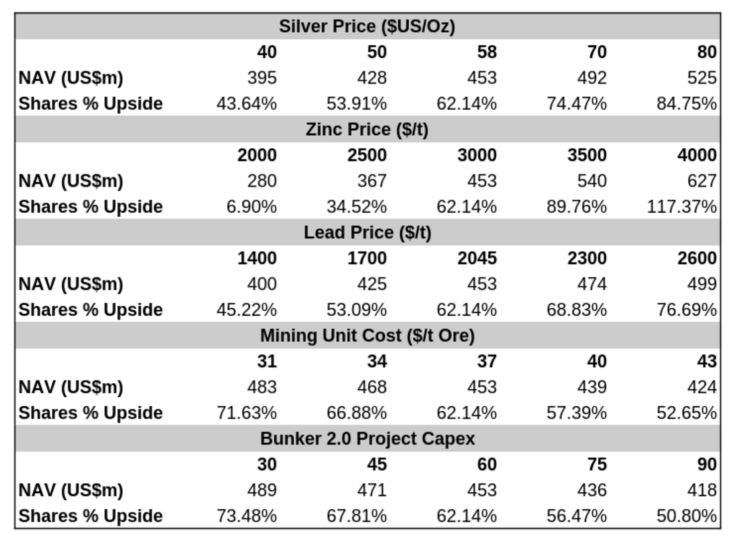 Commodity Price Risk: Downward volatility in Zinc & Silver prices would result in a materially lower NAV - $2,000 Zn yields just ~6% upside for the shares.